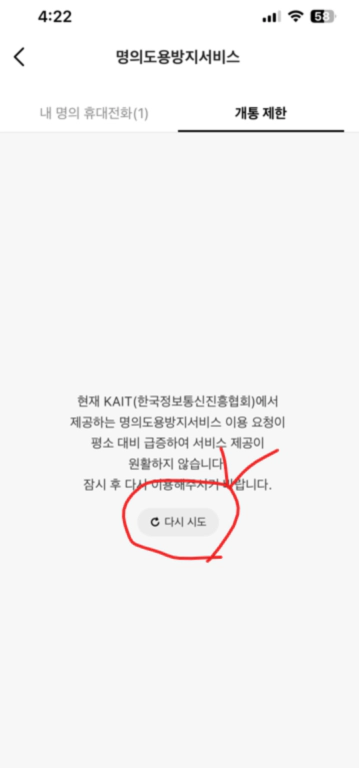 인증한 뒤에도 다시 원할하지 않다고 뜨면 '다시시도' 버튼을 눌러서 활성화 시켜주세요.