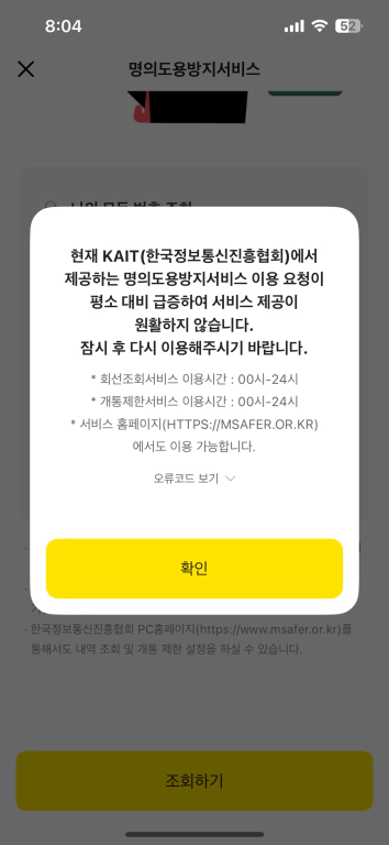 다행히 5월 1일 오후부터는 카카오뱅크를 통한 명의도용방지 서비스 신청이 다시 가능해졌더라고요! 저도 오전에 한 번 시도했다가 안 돼서 포기했는데, 오후에 다시 시도했더니 신청이 가능해서 얼른 진행했습니다.