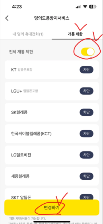 그리고, 내 명의 휴대전화는 몇인지, 또한 '개통제한' 탭으로 들어가면 각 통신사별 차단 현황을 볼 수 있는데요. 여기서 '전체 개통 제한'을 눌러서 모든 통신사들에 개통제한을 걸어두고 '변경하기'를 누르면 신청이 완료됩니다. 생각보다 간단하죠?