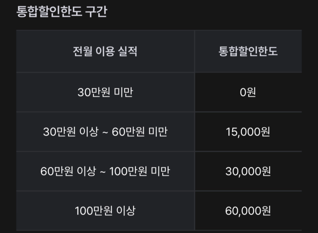 실제로 계산해보니 최대 월 6만원까지 할인받을 수 있어서 연간 최대 72만원까지 절약이 가능하더라고요. (아래 한도 다시설명)